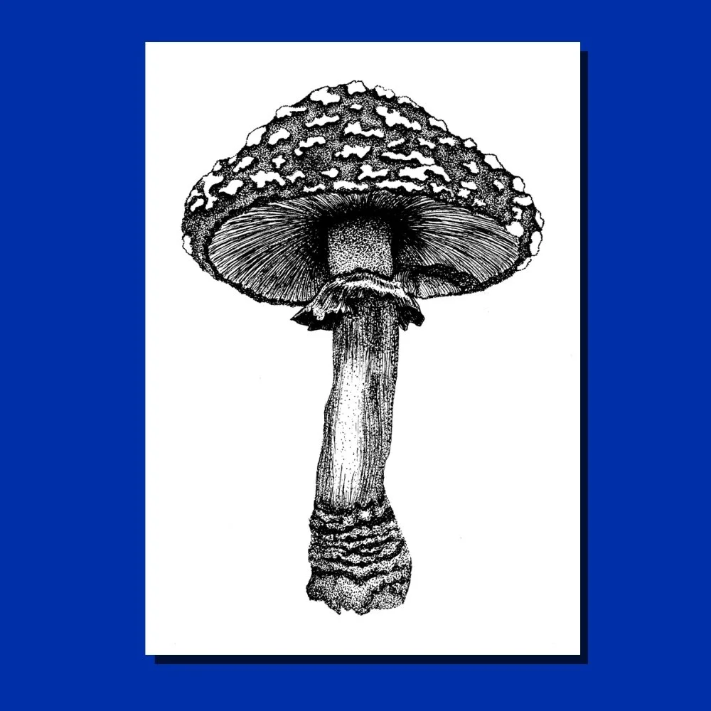 Illustrations traditionnelles en pointillisme noir et blanc et créations numériques pour une explosion de couleurs. Amanite tue-mouches Cèpes Girolles